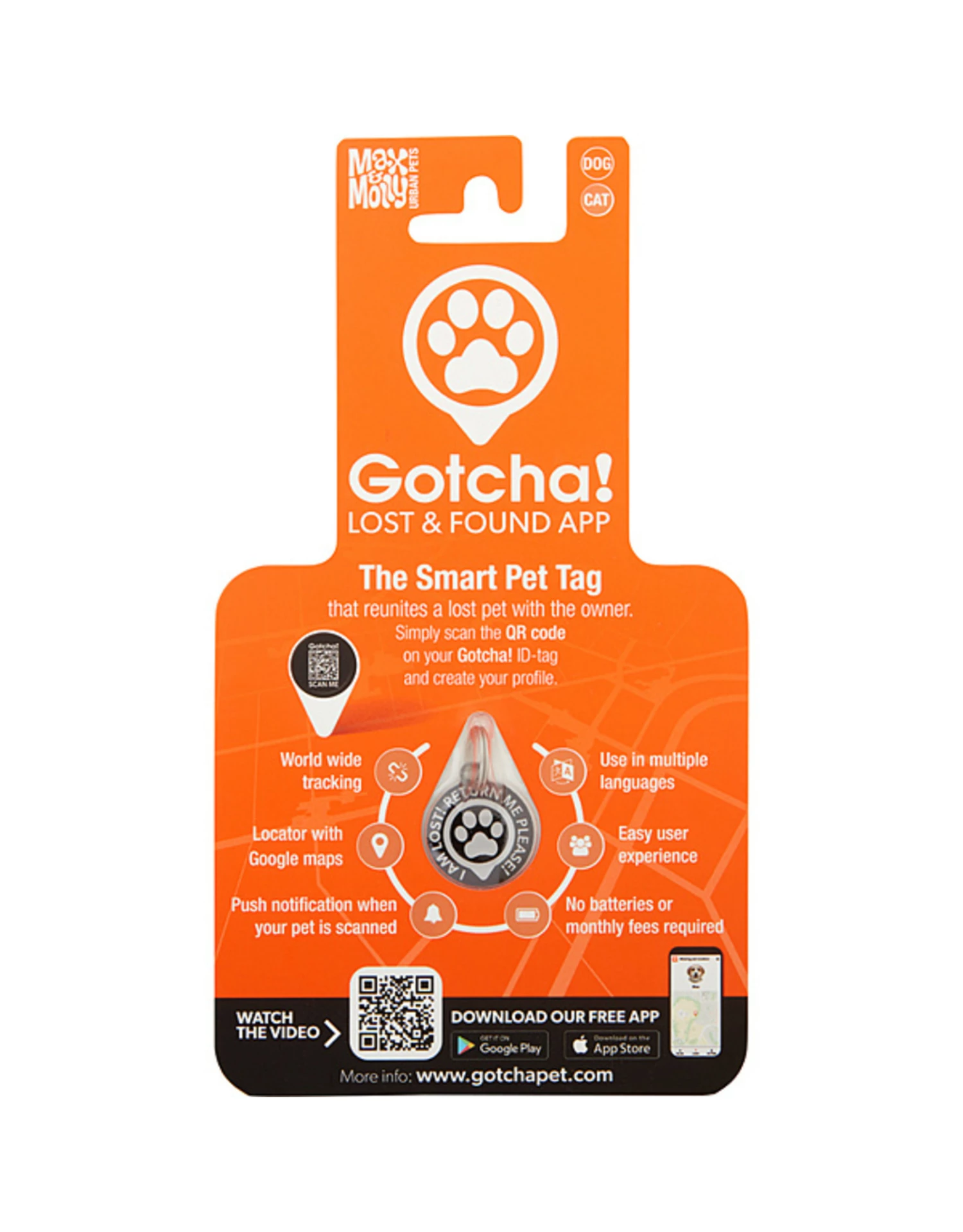 Stop worrying and get the Gotcha! Smart ID tag with an individual QR code that saves all important information needed to reunite you and your pet.